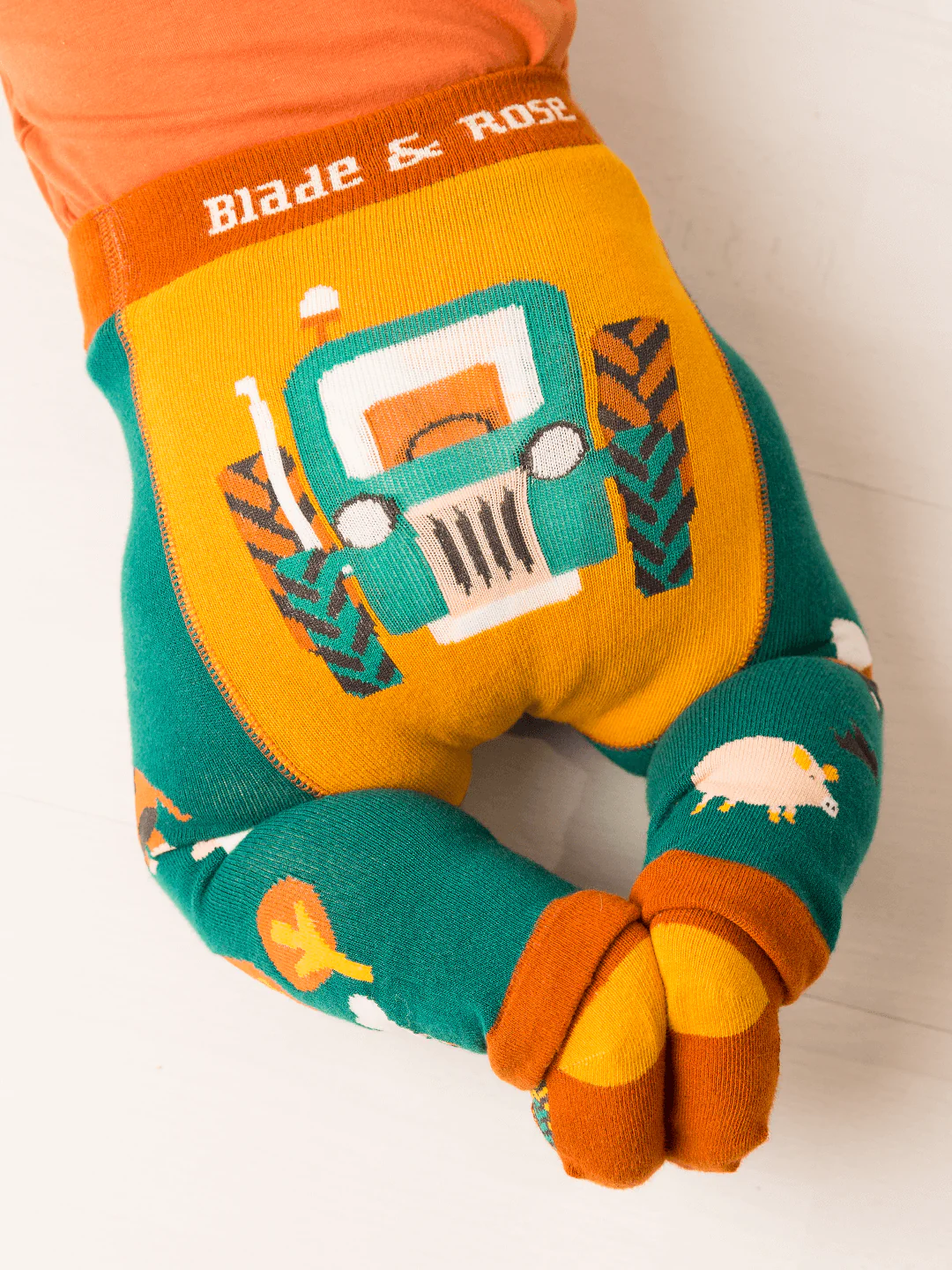 In a Dark Green & Tan colourway, these leggings feature a green tractor on a mustard background on the bottom, with farm animals on the legs, making them both playful and stylish.