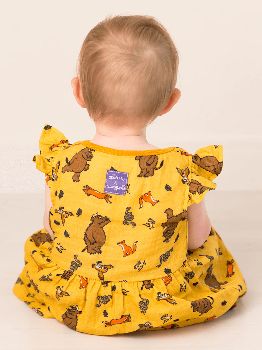 Soft cotton muslin sleeveless dress with all-over Gruffalo and friends printed on a soft mustard background. Keep them cool and stylish this summer.