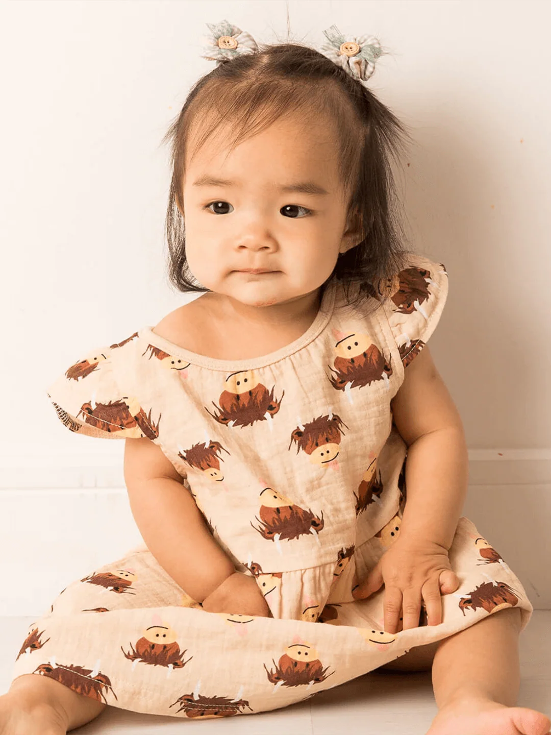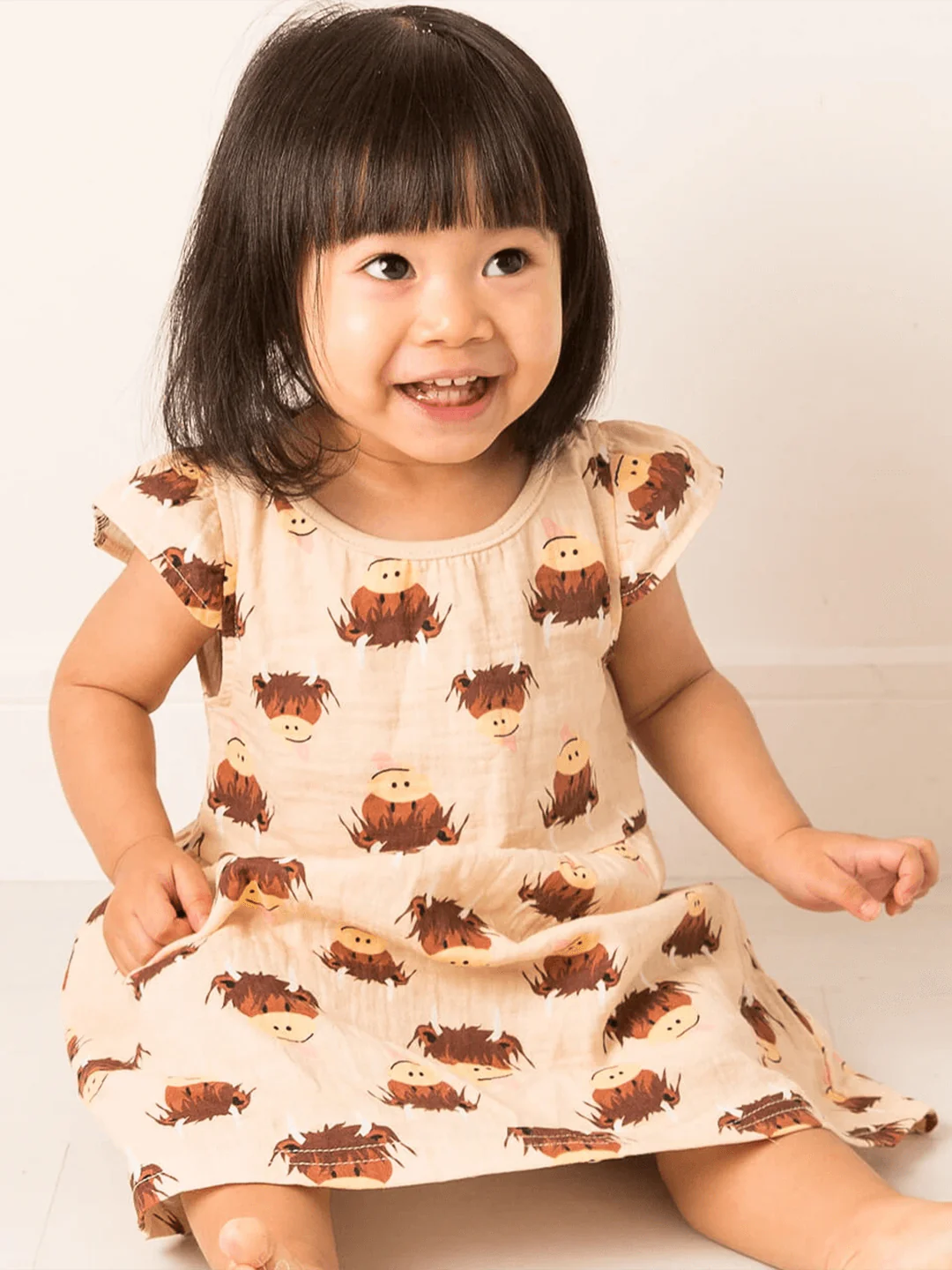Soft cotton muslin capped dress with all over Highland Cow printed on a soft cream background. Keep them cool and stylish this summer.