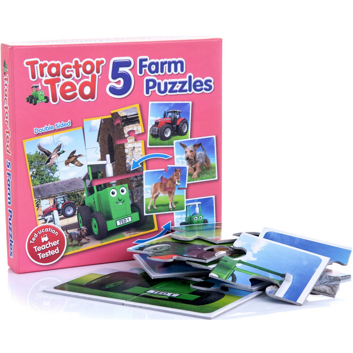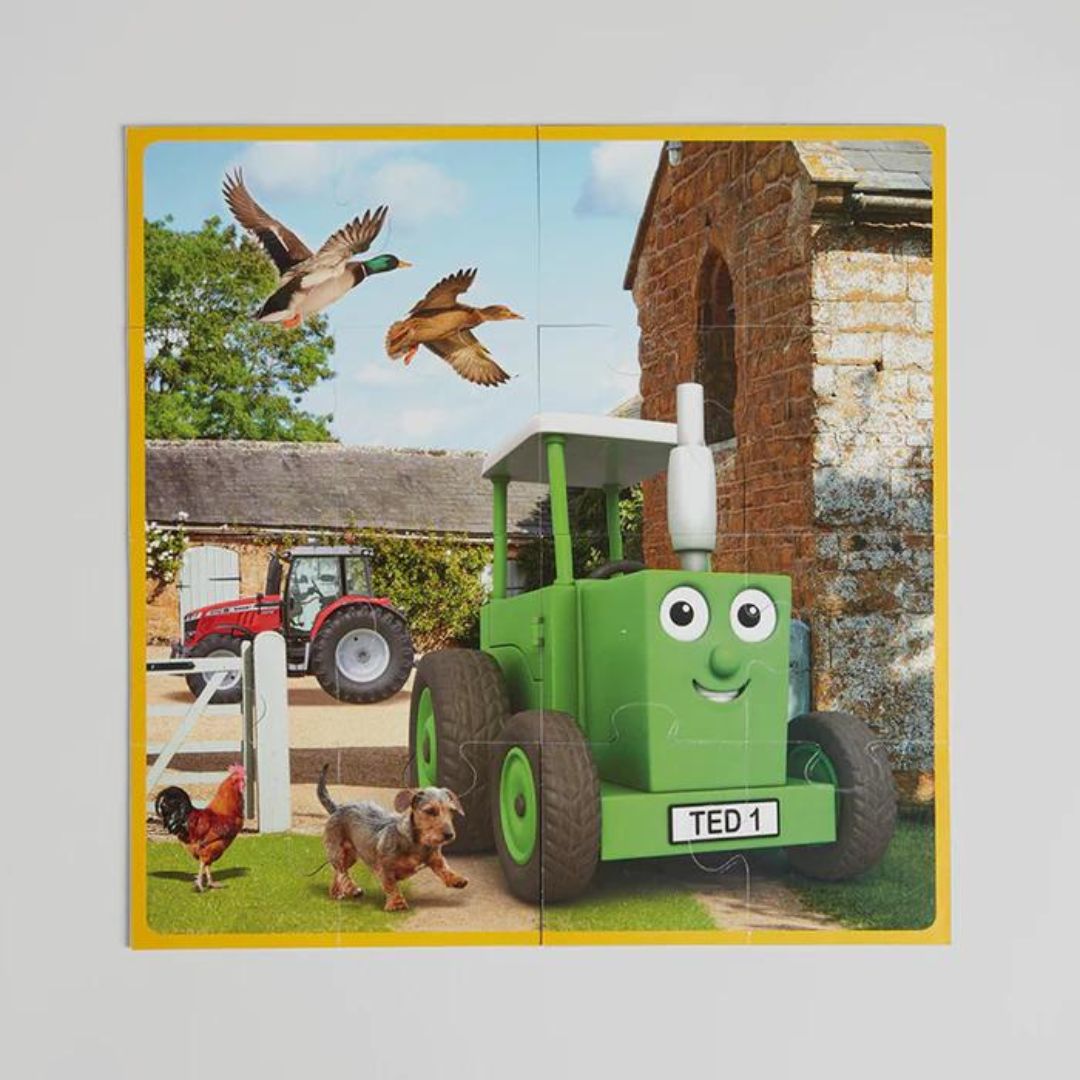 Five Tractor Ted Jigsaw puzzles in one box. Includes 4 x 4 piece individual puzzles and then once you turn them over they make 1 x 16 piece farm scene.