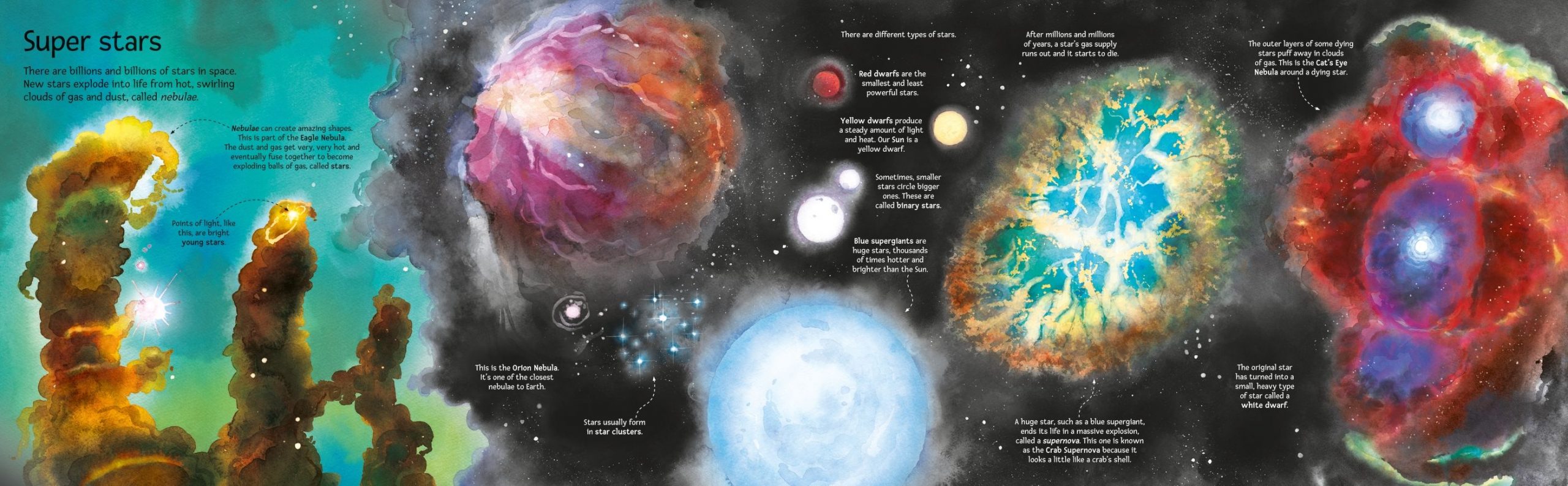 Children can explore the wonders of space in this incredible picture book with giant fold-out pages full of fascinating facts. From the Sun and the planets in the solar system to MASSIVE stars and VAST galaxies and lots, lots more. Ideal for helping kids learn to identify and name all the planets and many moons and stars as well. There’s a whole universe to discover…