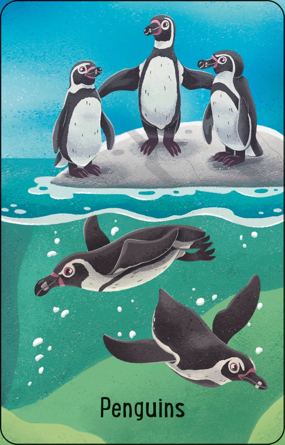 Animals included are: tigers, elephants, pandas. meerkats, penguins, giraffes, ring-tailed lemurs, frogs, crocodiles, macaws, zebras, tropical fish, butterflies